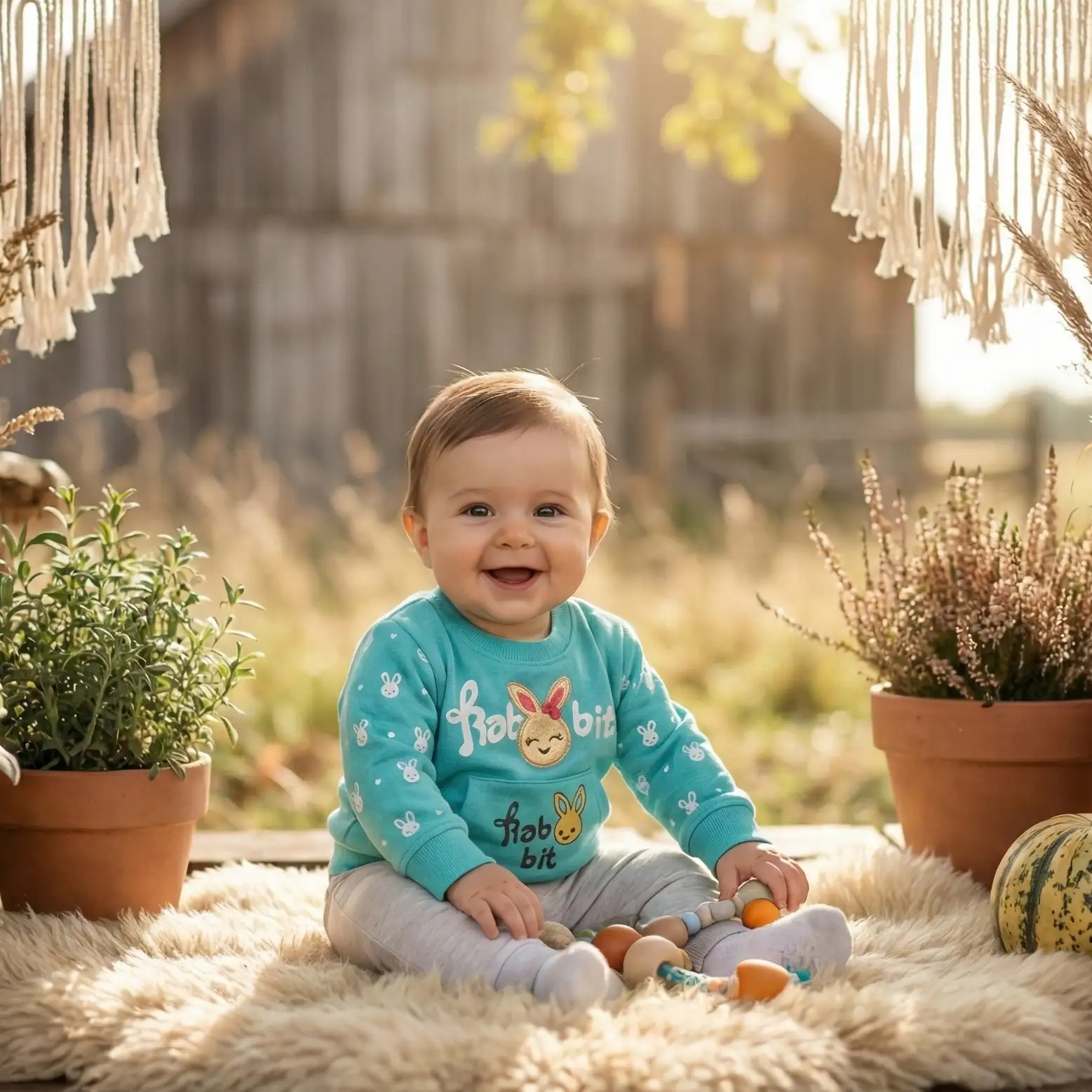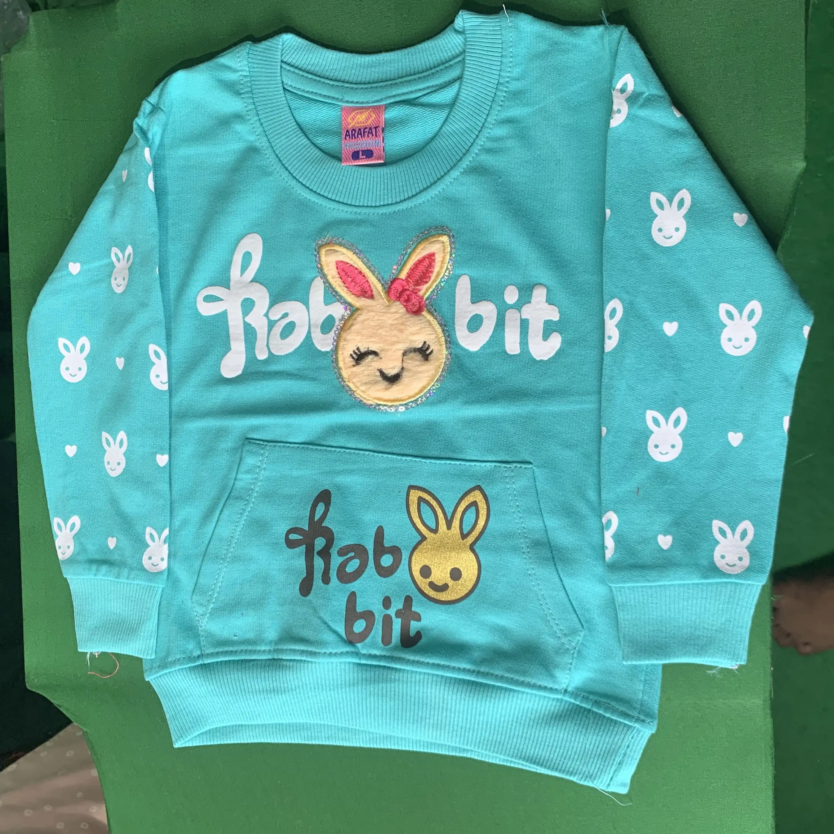 Adorable aqua-colored baby sweatshirt with cute bunny embroidery and front pocket design. Made from soft, warm, and skin-friendly fabric to ensure maximum comfort for your little one during cooler weather.