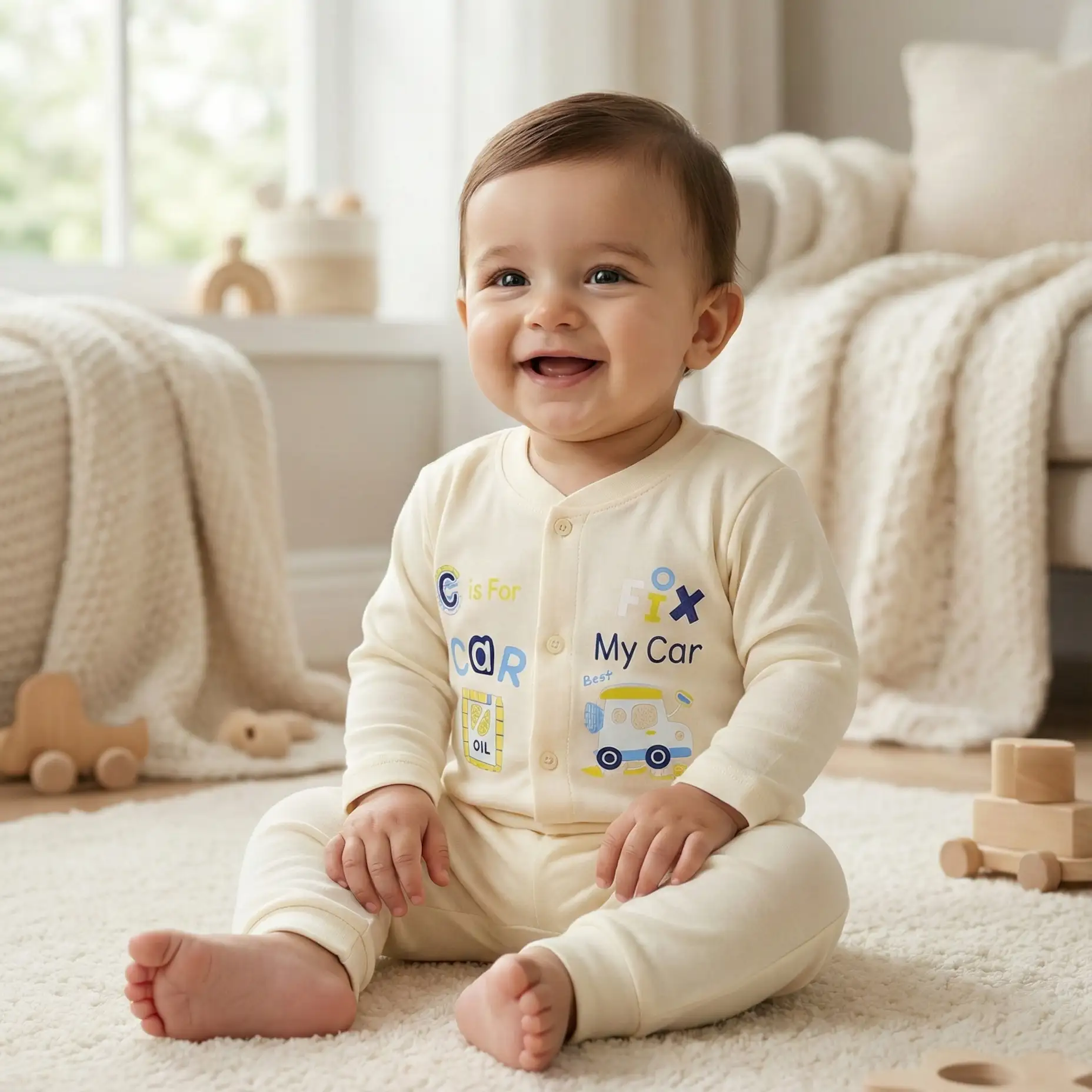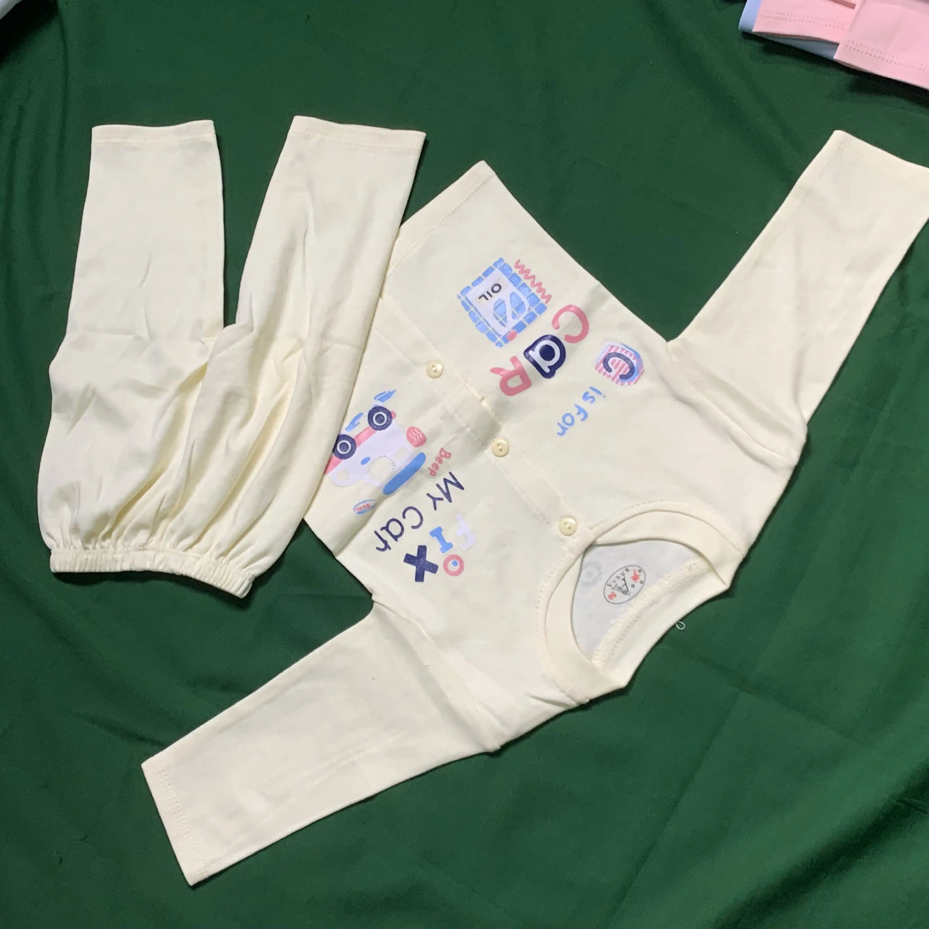 Soft and adorable cream-colored baby outfit with a fun car-themed print and front button design. Made from gentle, breathable cotton to ensure maximum comfort and a cute look for your little one.