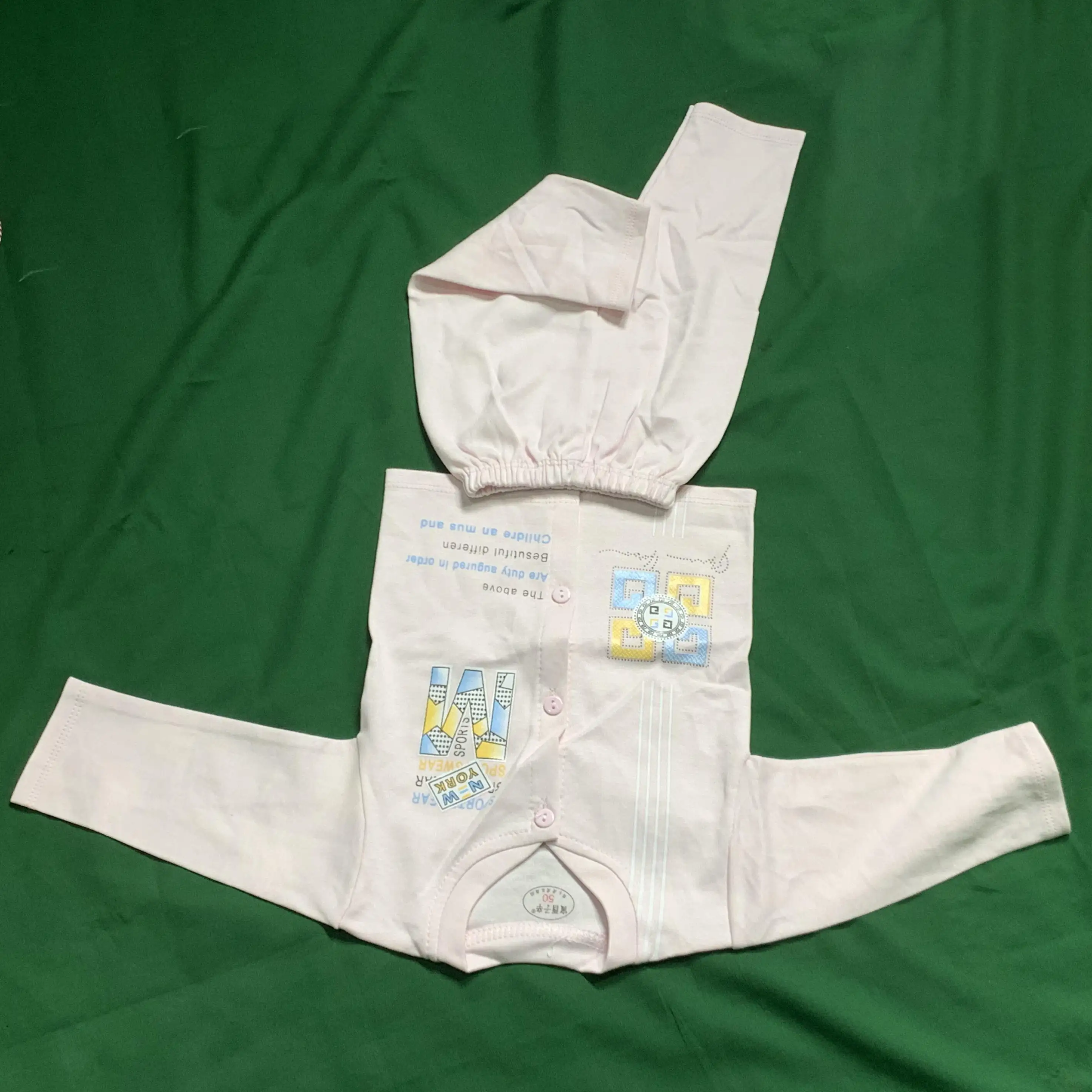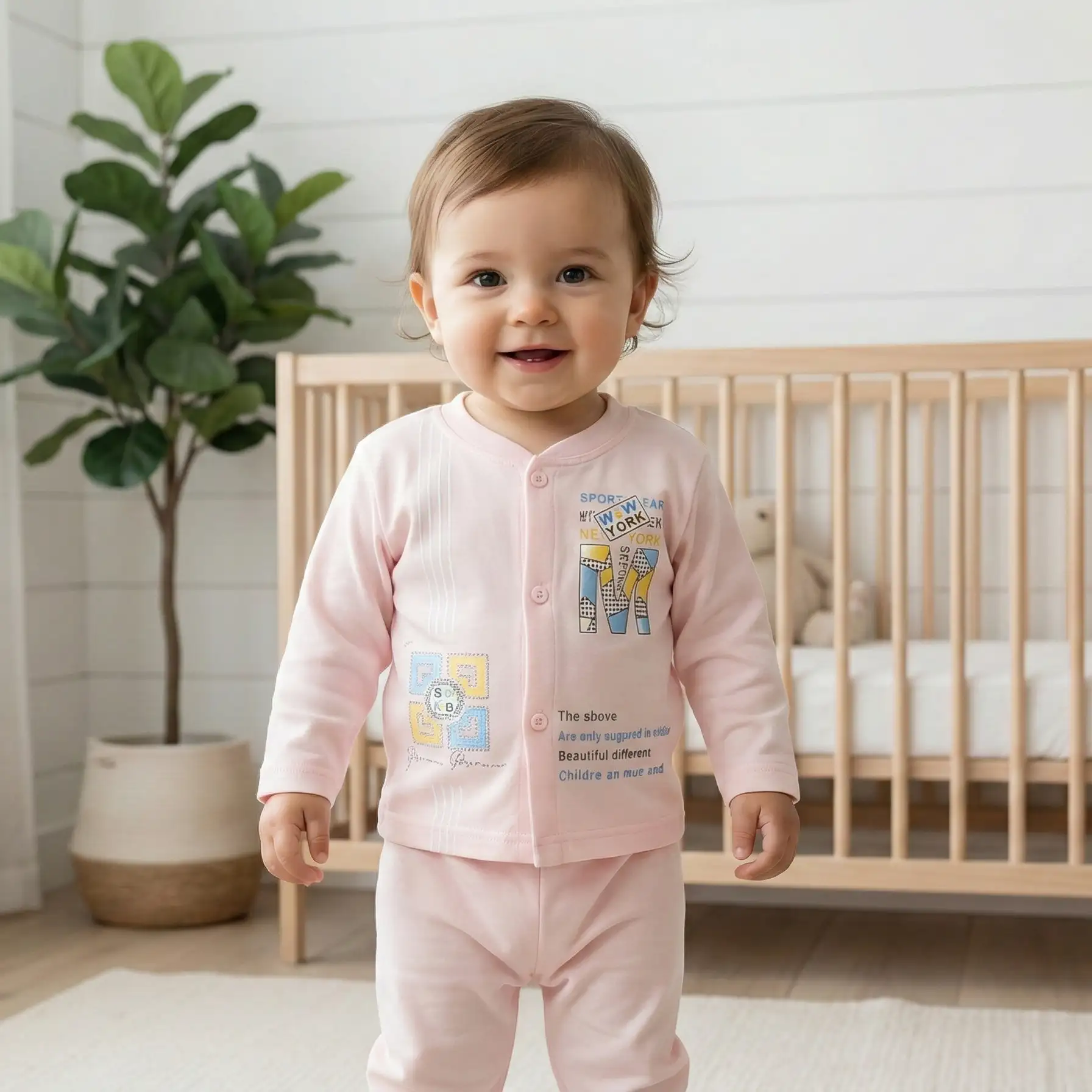 Charming baby pink outfit with cute printed design and front button style top paired with a comfortable matching pant. Made from ultra-soft and breathable cotton, ensuring gentle comfort for your baby all day long.